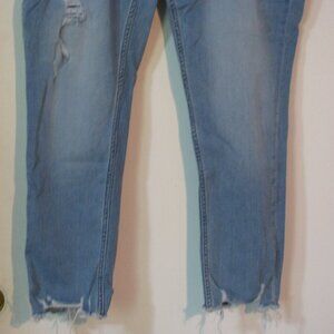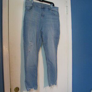 Justice jeans in plus size 24. Labeled mid rise super skinny by the manufacturer, these jeans have intentional distressing ripped torn design. Fringes torn bottom hem, ankle or cropped style. Light wash, zip and button front close. Skinny leg style, super cute. Made from a cotton/viscose/polyester blend with 1% spandex, machine wash.