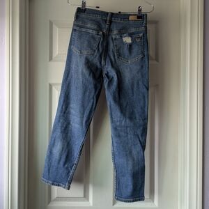 Stylish straight jeans with a distressed look. Comfortable and versatile for everyday wear. Classic blue color.