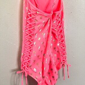 Justice Orange one piiece suit with Gold Palm Trees and Lace Up detailing on each side. Criss cross back