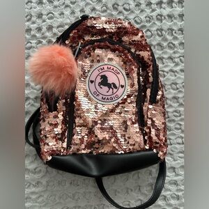 Sparkling sequin backpack with unicorn patch. Fluffy pom-pom detail. Perfect for kids.
