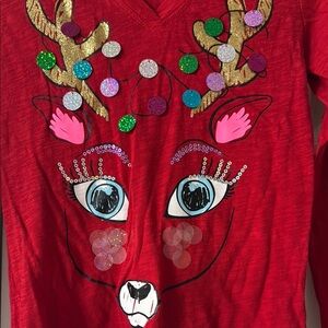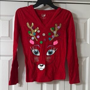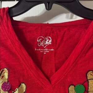 This vibrant red long sleeve tee from Justice features a unique reindeer design with cactus antlers, adding a playful twist to traditional holiday wear. The shirt's casual knit style and v-neck collar make it a comfortable choice for festive occasions.