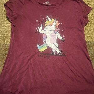 This delightful short sleeve tee from Justice showcases a whimsical unicorn graphic, adding a playful touch to your wardrobe. The vibrant red color enhances the fun design, making it a standout piece for casual outings.