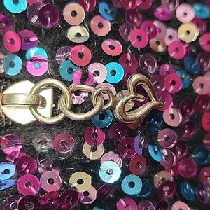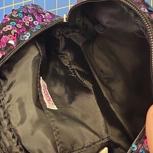 This mini bag features a rounded, slouchy shape with a wide base, crafted from a sequined fabric that shimmers with multicolored sparkles. The straps add a striking contrast, making it a standout accessory for any occasion.