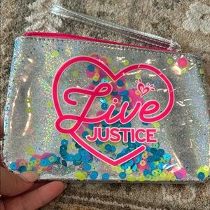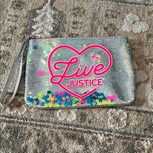 Shiny silver wristlet with vibrant neon sequins. Bold 'Live Justice' heart design. No damage, stains, or odor. Smoke free home!