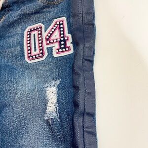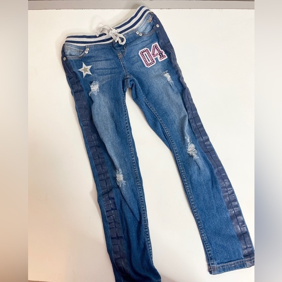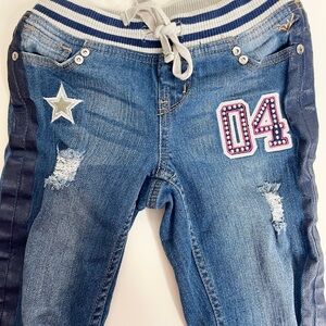 A full pair of distressed jeans with a shimmery racing stripe down the sides and full glittery patches sewn on. Plus they have a comfort jersey pull on waist with drawstring.