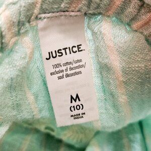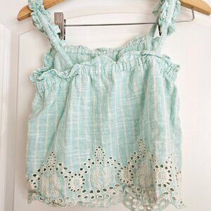 Light flowy bohemian crop top perfect for hot summer days. Adorable ruffled straps and eyelet details at the hem. Vertical white stripes on seafoam background. Smoke-free home.