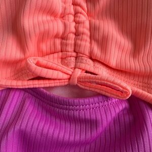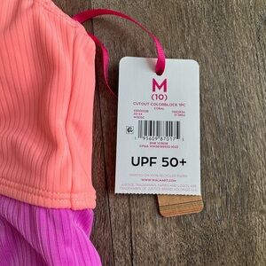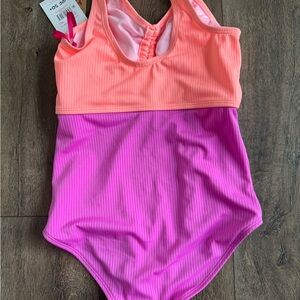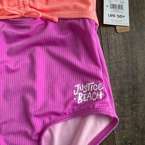 Justice Swimming Suit. One piece with cutout. Girl’s size medium (10). Neon orange/coral color on top and pink/purple color on bottom. New with tags!