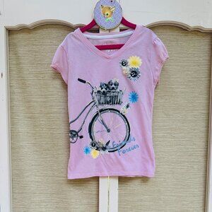 Girls pink short-sleeved T-Shirt from Justice. Features two puppies sitting in a bike basket. Bedazzled with tutu fabric flowers, glitter and rhinestones. Girls size 8. In gently used condition.