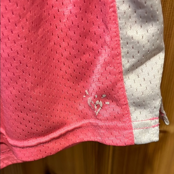 Vibrant pink shorts with soft white accents. Breathable mesh design. Ideal for active wear.
