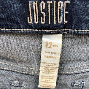 These Justice denim leggings in size 12 Plus offer a stylish and comfortable fit with a mid-rise design. Made from a blend of cotton, polyester, and elastane, these leggings provide flexibility and durability. The distressed detailing adds a trendy touch to the classic denim look, making them a versatile addition to your wardrobe. With frayed edges and back pocket embroidery, these leggings combine fashion and function effortlessly.