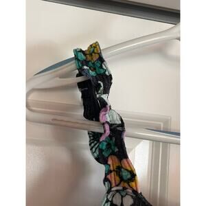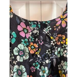 1. Top 1: A dark floral ruffle strap tank with vibrant pastel blooms in teal, yellow, and lavender. Soft crinkle texture and a swingy silhouette give it a cottagecore-meets-boho aesthetic.