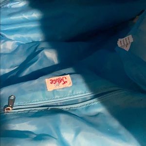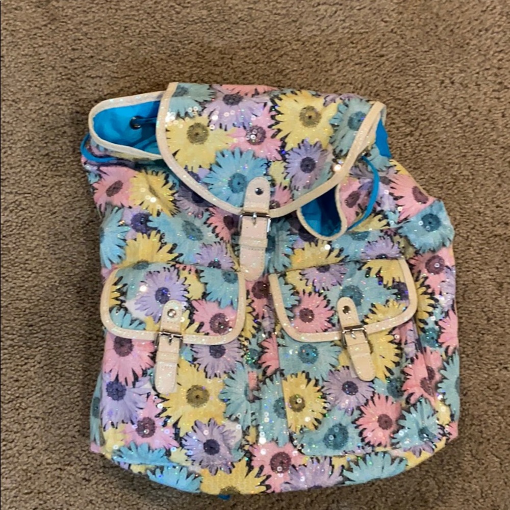 It’s a glitter, flower pattern backpack , inside is blue , the colors of flowers are purple , yellow and blue . New , never wore