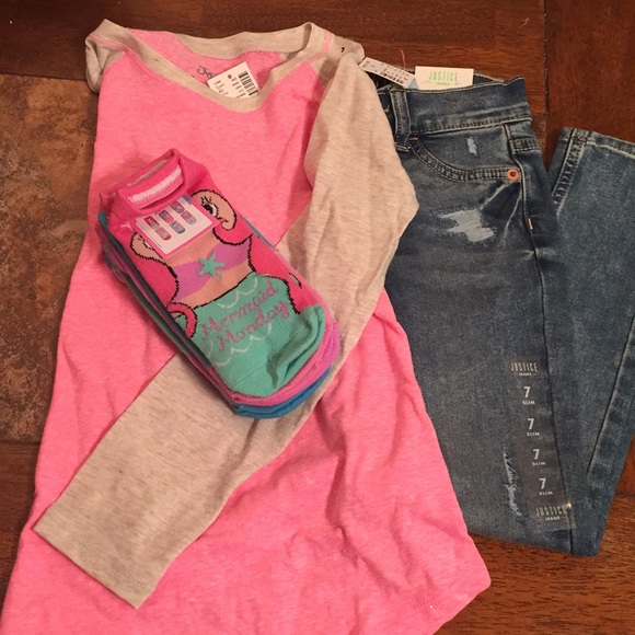 A great little bundle for girls. The jeans are jeggings. The socks are the days of the week size s/m. The top and pants are size 7. Please don't ask to separate