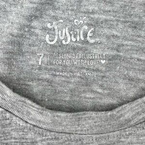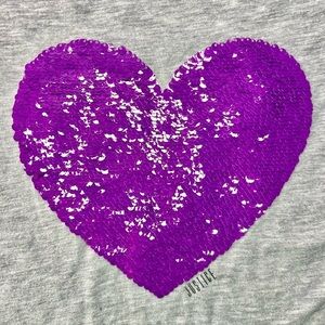 Justice grey short sleeve t-shirt with flip sequin heart. One side is purple and the other has a smile emoji, a rainbow with a star, and a diamond. Girls Size 7