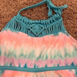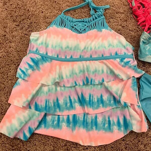 Justice girls large 12 swim set top bottom bikini tankini blue tie dye fringe
