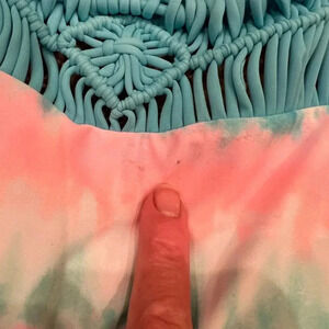 The tie dye ruffle tankini top has one small mark near top that I point tp in the pic