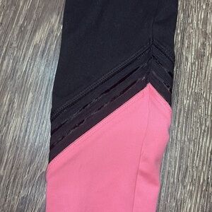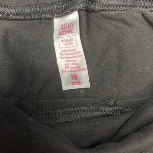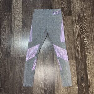 2 pairs of girls size 10 leggings. Both are justice brand. First pair is black with pink detail and ‘dance’ down the side. There is some netting detail. The second pair are gray with shiny purple detail.