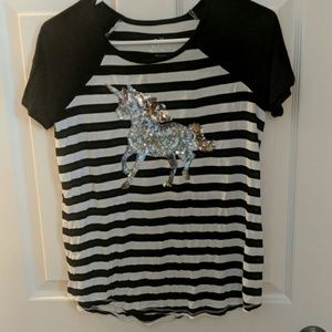 Justice girls 14 size top with unicorn sequins on the front and black and white stripes find it excellent condition only one a few times