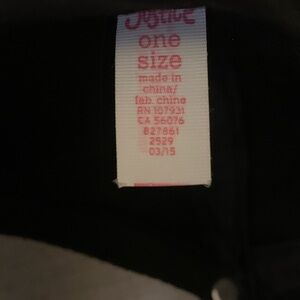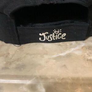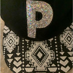 Hat from Justice. P in glitter on the front of hat and kind of an Aztec pattern with glitter on the bill of the hat. Adjustable velcro closure on back with Justice wrote on it. She only wore it in the house a couple times. EUC. Color is black and silver. Size is OS