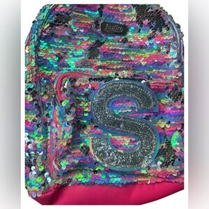 Justice sequins backpack with S initial. Gently used. See photos for condition. Outside looks like new. It has one pen mark on the inside.
