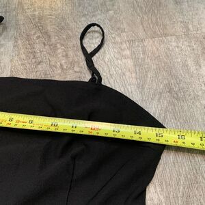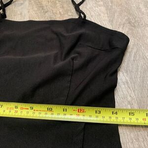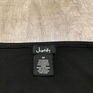 Justify black romper. Spaghetti straps, square neckline, mock wraps skirt bottom that has shorts underneath it (a skort). Lots of stretch. Pull on.