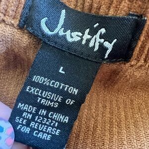 This Justify size large dark brown corduroy miniskirt is a stylish throwback to the Y2K era, perfect for embracing those cozy fall vibes. Crafted from 100% cotton, it offers both comfort and a touch of nostalgia in its design.