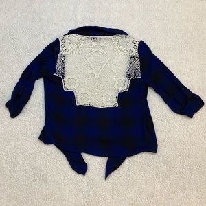 Justify Women’s Blue Black Plaid Cardigan Lace Back Size Small 3/4 Sleeve Cuffed