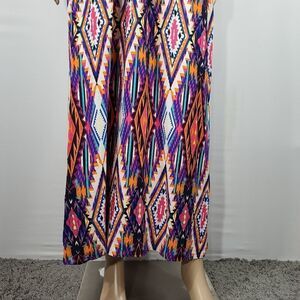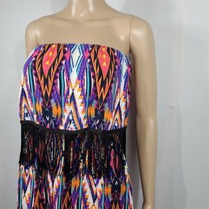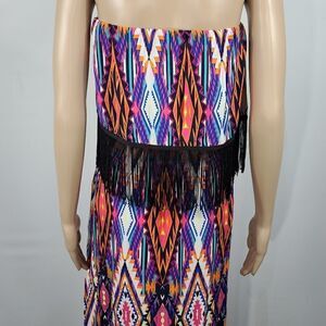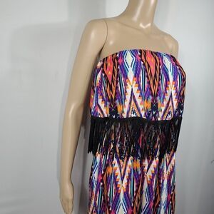 Justify blue, orange, and pink diamond style print strapless maxi dress with an elastic waist and fringed top.
