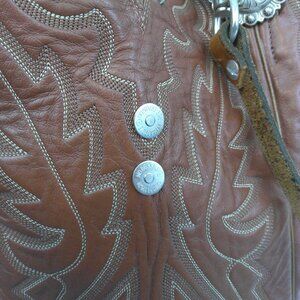Western style bucket purse, made from repurposed Justin brand cowboy boots. Lovely medium brown, with nice classic stitching, and a touch of exotic leather at the base. Embellished with classic star conchos for the double magnet close, made from a repurposed basketweave pattern belt. Silver studs on the edge. Removeable 28 inch handle/shoulder straps, made from real bridle leather and snaps, attach to the boot pulls.