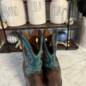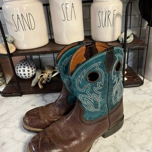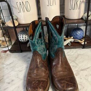 Elegant leather boots with teal embroidery. Ideal for a standout western style.