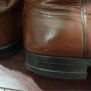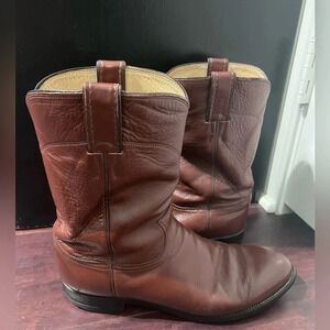 Justin Boots Mens Western Brown Leather Cowboy Sz 9.5 D Style 3404 Excellent. Please see pics for any scratches. The right boot has a couple scratch marks on back just above heel and one on the side. Boot stands 10 inches tall.