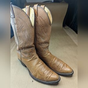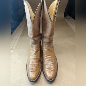 Justin Boots style 2530 men's 11.5B Tan distressed leather classic Western cowboy boots. Some Scuffs and stains. See pics.