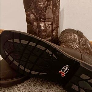 Stylish cowboy boots with a brown and camouflage design. Perfect for outdoor adventures. From nonsmoking home. In gently used condition. Boots are steel toe
