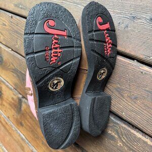 In Excellent, Lightly Worn Condition! Justin L9901 Ladies Pink and Brown Gypsy Western Boot with Bay Apache With Perfed Saddle Foot and a Round Toe in Women's 9B - Featuring J-Flex Flexible Comfort System With Removable Orthotic Insert Insole for all day comfort. This boot also features a Fashion Round Toe with Unit Shoe Heel and Black Rubber for long wear. Whether out on the town or working on the ranch, you won't go wrong with the purchase of this fine Justin product. Styled for the. Justin Boots, makers of fine quality western boots boots and shoes since 1879.