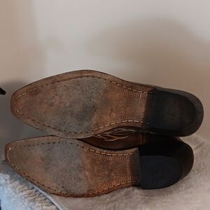 Stylish brown leather cowboy boots featuring a cross and unique tribal design. Size 8.5B. Perfect for adding a western flair to any outfit.