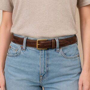 Authentic Justin men’s belt made with genuine lizard skin leather. Features a brown exotic textured finish and gold-tone buckle. Made in the USA. Size 40. A durable, western-inspired piece that pairs well with jeans or dress wear.