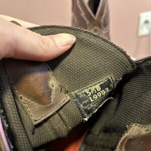 Good used condition. Some scuffs, watermarks, creasing and dirtiness from being worn. Light purplish color trim and stitching.