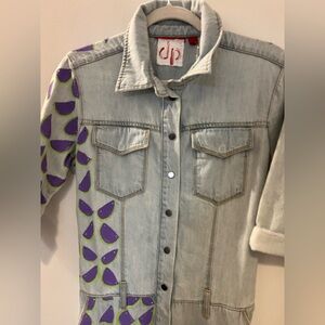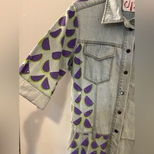 Stand out with this one-of-a-kind light wash denim jumpsuit featuring an eye-catching half-and-half design. One side and sleeve are hand-painted with a bold purple and green abstract watermelon seed pattern, adding a fun and artsy twist to a classic utility style. Button-up front with flap chest pockets, rolled sleeves, and cuffs give it a cool, casual vibe. Perfect for festivals, street style, an elementary teacher or just making a statement.