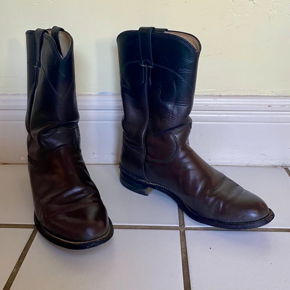Dark brown Justin Roper Boots have a few miles on them and as you can see still are full of life. Note that they are dark brown fading into black on the tops. They are size 7C.