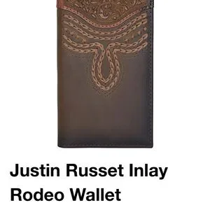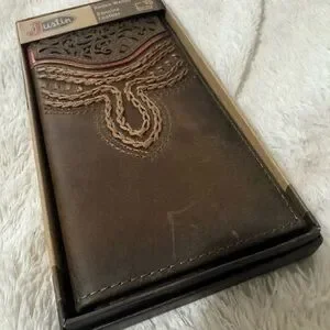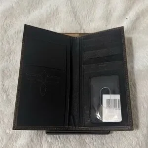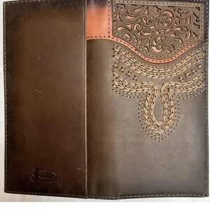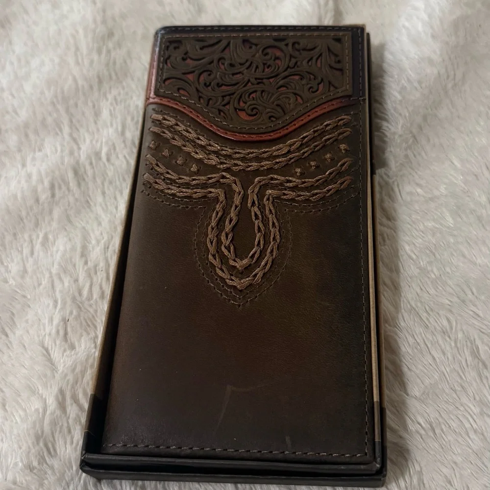 Intricate men's rodeo wallet features a dark brown leather with a taupe tooled panel over a russet inlay with an embroidered yoke.