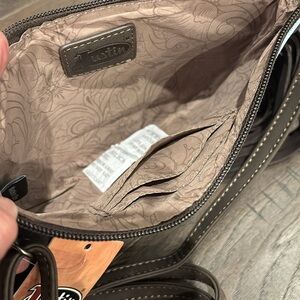Justin Suede Look Fringe Tooled Sunflower,zip top,adjust/removable strap,pockets
