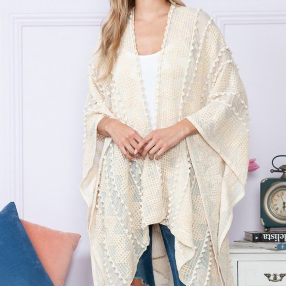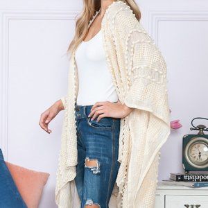 With an asymmetrical design, this pom-pom cardigan is soft and flowing. The asymmetrical hem adds to the unique style of this cozy look.