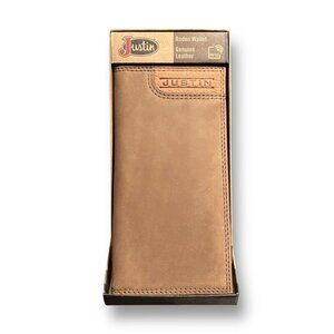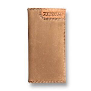 Description: Crafted from genuine leather, this Justin rodeo wallet offers timeless Western style with practical functionality. Features a two-tone finish, embossed Justin logo, multiple card slots, clear ID window, and RFID protection for security.