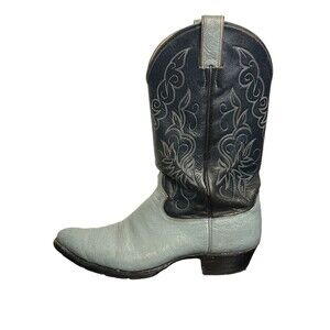 The Justin Western 5040 Boots in size 10 1/2 are stylish grey leather mid-calf boots with a geometric pattern and pointed toe shape. Featuring a pull-on closure, these boots are perfect for various occasions including travel, activewear, weddings, parties, casual outings, formal events, work, and business meetings. The boots are accentuated with embroidered details and have a rugged Western cowboy theme, making them a versatile and fashionable choice for any man's wardrobe.