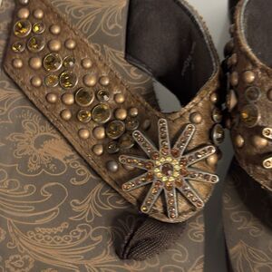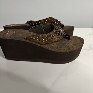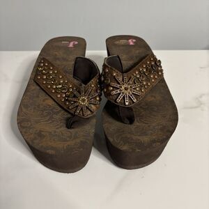 Justin Western Bling Platform Flip Flop Sandals Beaded Studs Wedge Brown Size 8
