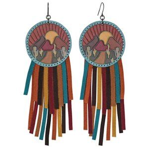 These earrings showcase a vibrant desert sunset design, complemented by colorful fringes. Made from genuine leather, they add a bold touch to any outfit.