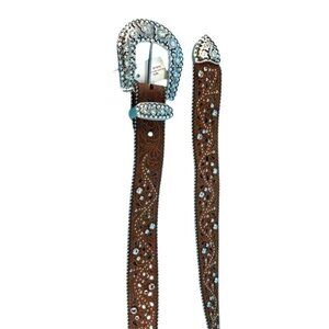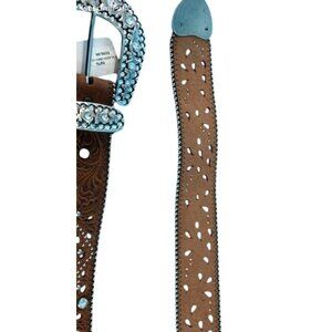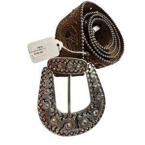 Justin Western Style Leather Belt With Silver Rhinestone Buckle & Floral Cutouts