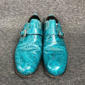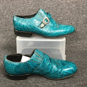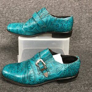Step into Western-inspired elegance with these rare Justin women’s green tooled leather monk strap loafers. Crafted with intricate floral embossing and a bold turquoise hue, these shoes offer timeless cowboy charm with a refined edge. Perfect for adding personality to any outfit, they combine classic craftsmanship with standout design.