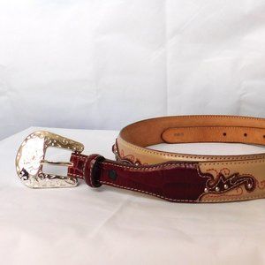 Justin Womens Leather Belt Size 36 Tan Red Applique Silvertone Buckle Tan