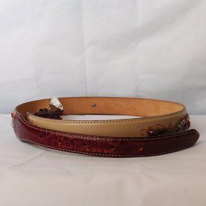 Justin leather women's western belt in size 36. Belt is tan and burgundy red leather accented with appliques on back . Width of belt is 1 1/4 inch.